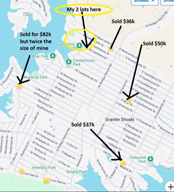 My 2 lots total are 10,000 sq ft. Here are some recent sales right near my lots which they are $36k, $37k and $50k all are the same size as my two are smaller. There is another sale of a lot that is twice the size of mine that recently sold for $82,000 and I will show that below also.